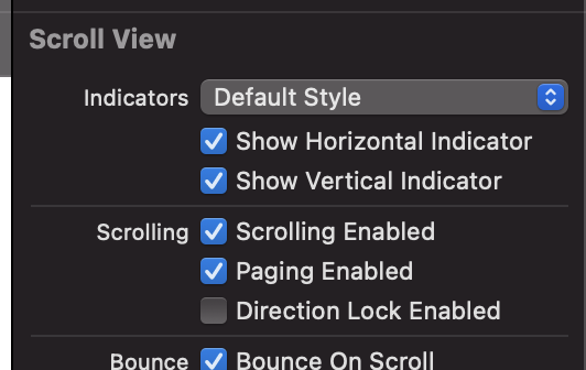 가로 스크롤은 먼저, 페이지 방식으로 넘어가도록 하기 위해 Paging Enabled를 활성화해주었다.
