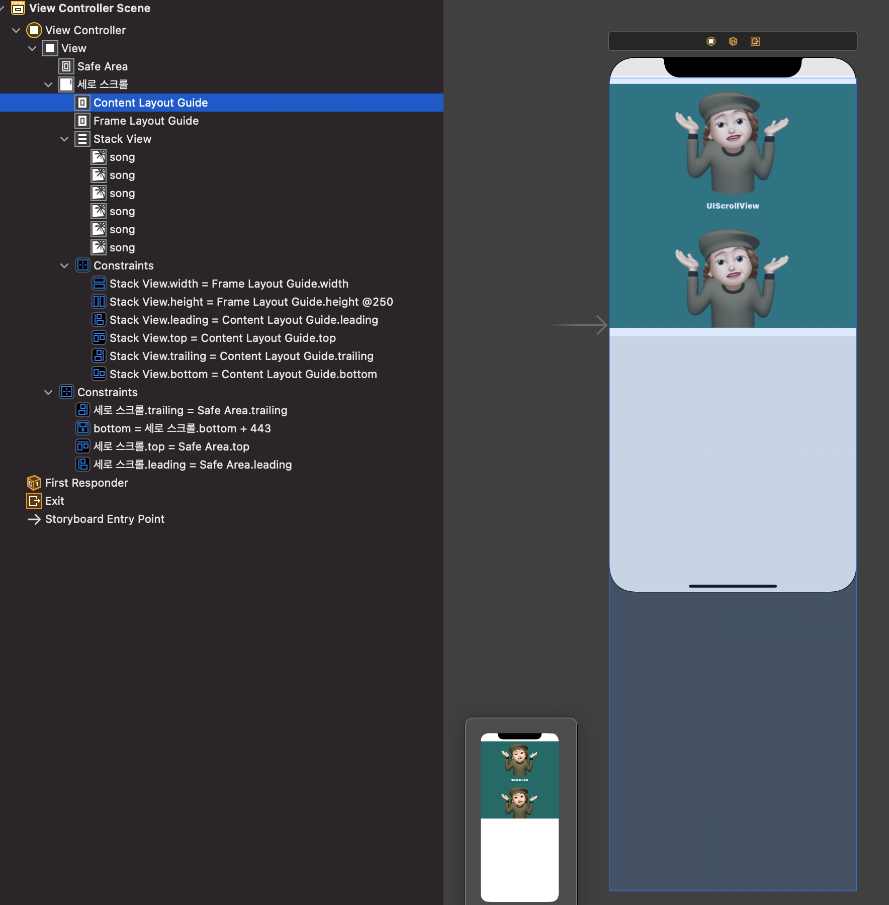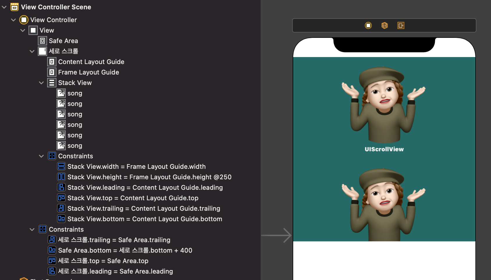 화면의 반 정도 크기로 ScrollView를 만든 뒤, 서브뷰로 Vertical StackView를 추가해주었다.