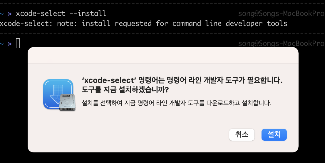 명령어 라인 개발자 도구 설치 안내 메시지가 뜨고 설치를 진행해주면 된다.
